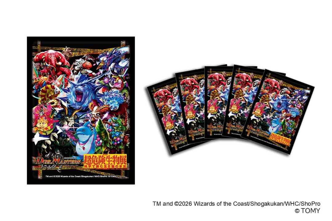 本展と「デュエル・マスターズ」(略称:デュエマ)のコラボレーションが実現!展覧会キービジュアルをイメージしたデュエマの歴代人気クリーチャーたちが多数登場するオリジナルデザインのコラボカードスリーブ(42枚入り)を4月7日(火)から販売します!